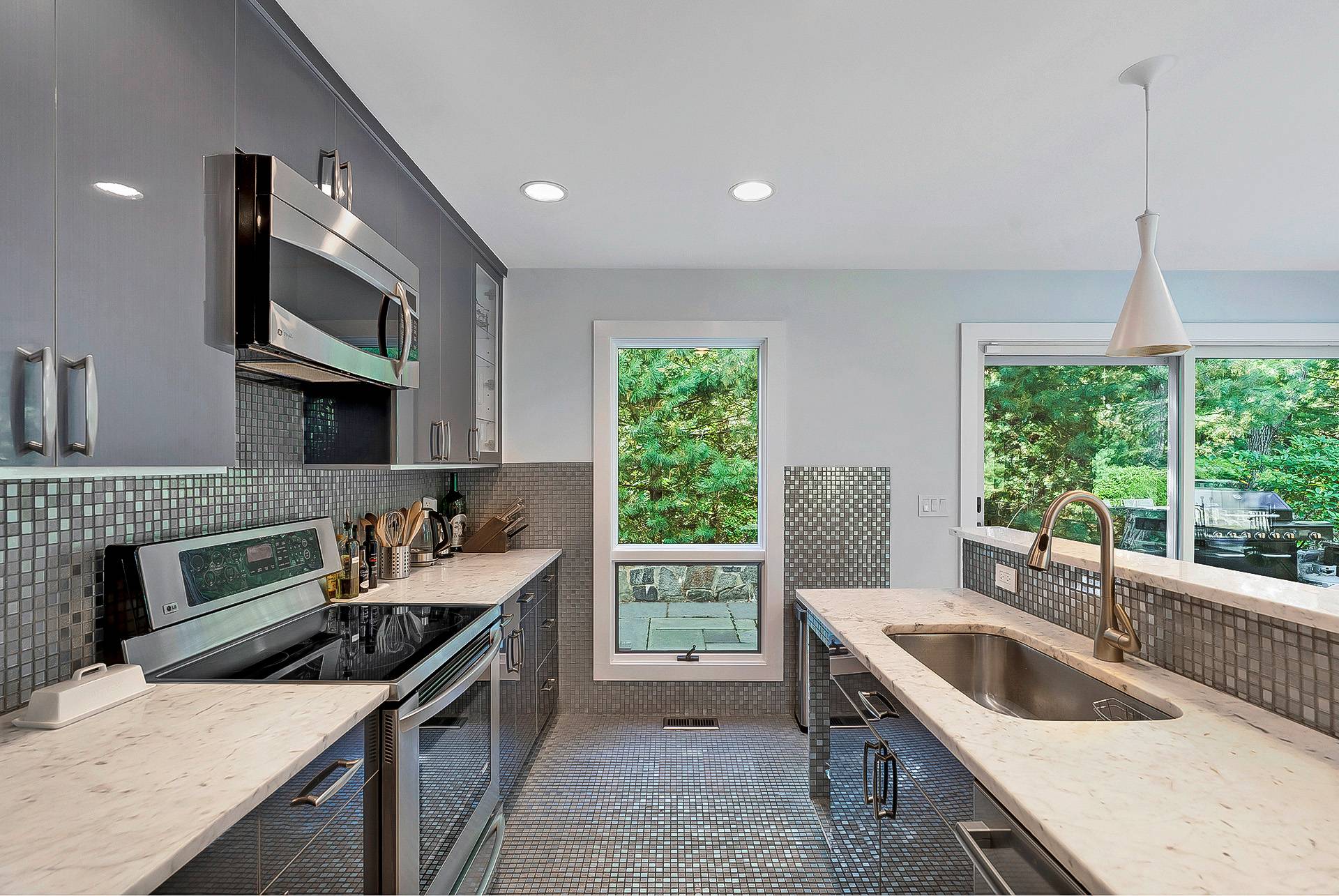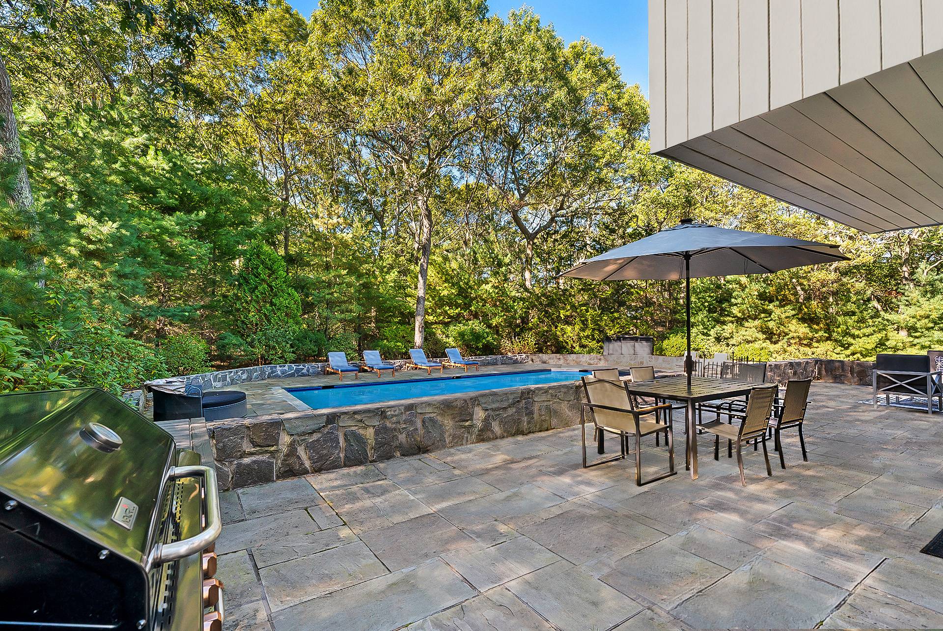 This gated modern contemporary residence, designed by renowned architect Myron Shulman, is a rare Hamptons offering that combines modern elegance with timeless sophistication. A sun-filled entryway opens to an expansive great room with soaring double-height ceilings and glass sliders, creating a seamless connection between indoor and outdoor living. Ideal for entertaining, the open layout flows effortlessly to the landscaped grounds and the 25' x 50' heated saltwater Gunite pool. The first-floor primary suite offers ample space with an ensuite bath and a private deck overlooking the lush, mature gardens. A versatile guest suite or office with a full bath also serves the main level. Upstairs, two well-appointed bedrooms-one with a private balcony-share a refined bathroom. The finished lower level provides additional living space and a private gym, completing this exceptional home. Located just moments from Sammy's Beach and several other private bay beaches, as well as East Hampton Village, this property encompasses the Hampton's lifestyle-private, tranquil, easily accessible to fun outdoor activities, high end village shopping, and fine dining.